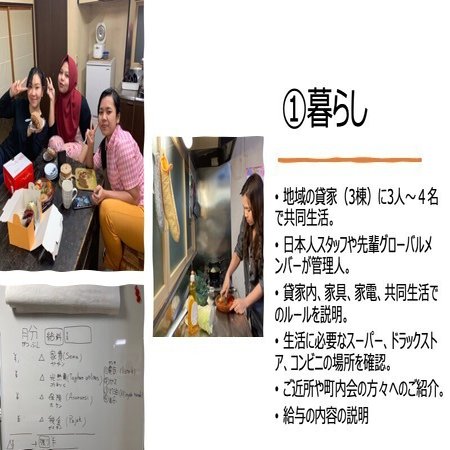 ・地域の賃貸(3棟)に3~4名で共同生活、日本人スタッフや先輩の技能実習生が管理人として関わり、問題が起こった時でも安心して対応できる体制を整える