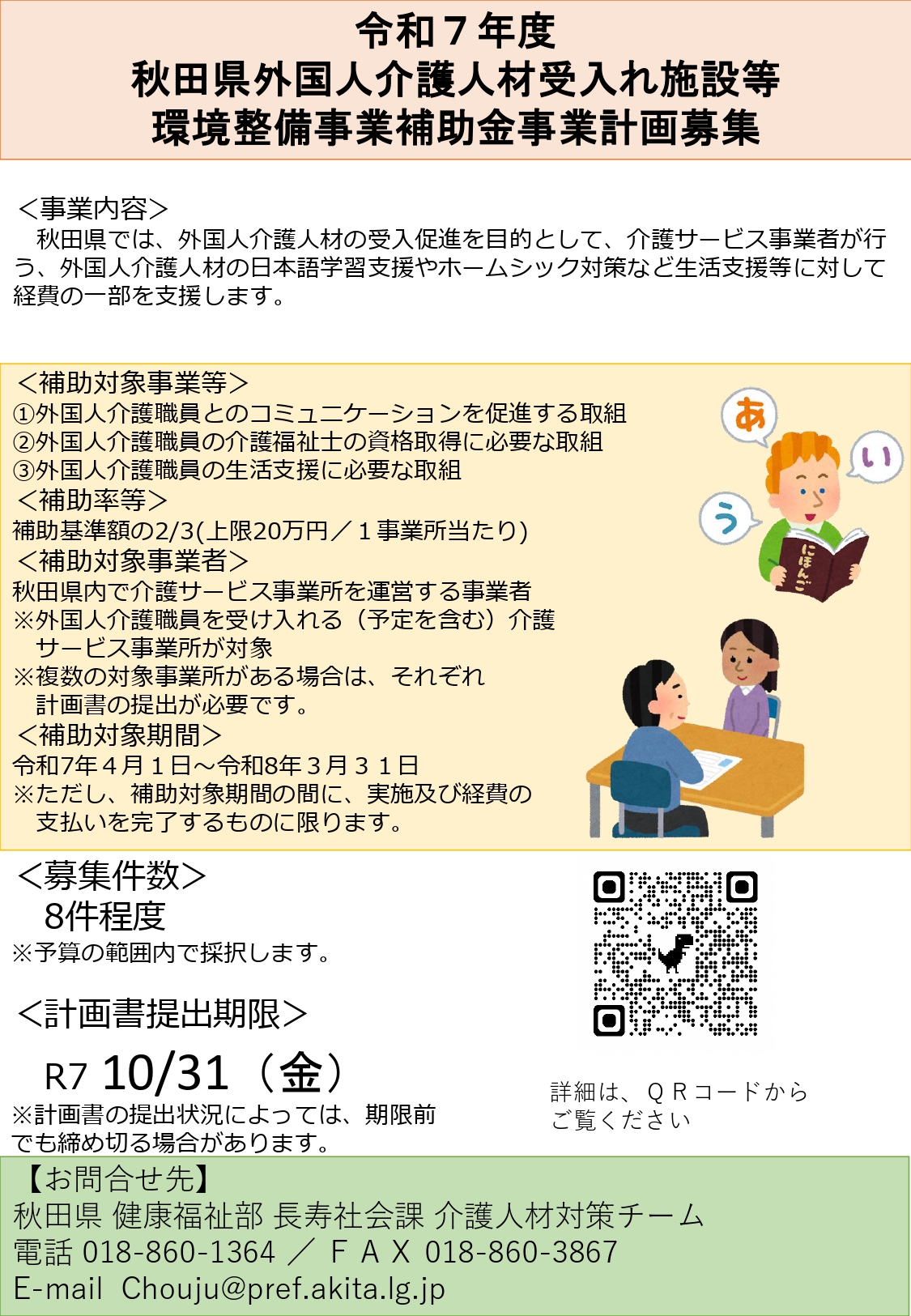 令和7年度秋田県外国人介護人材受入れ施設等環境整備事業補助金について