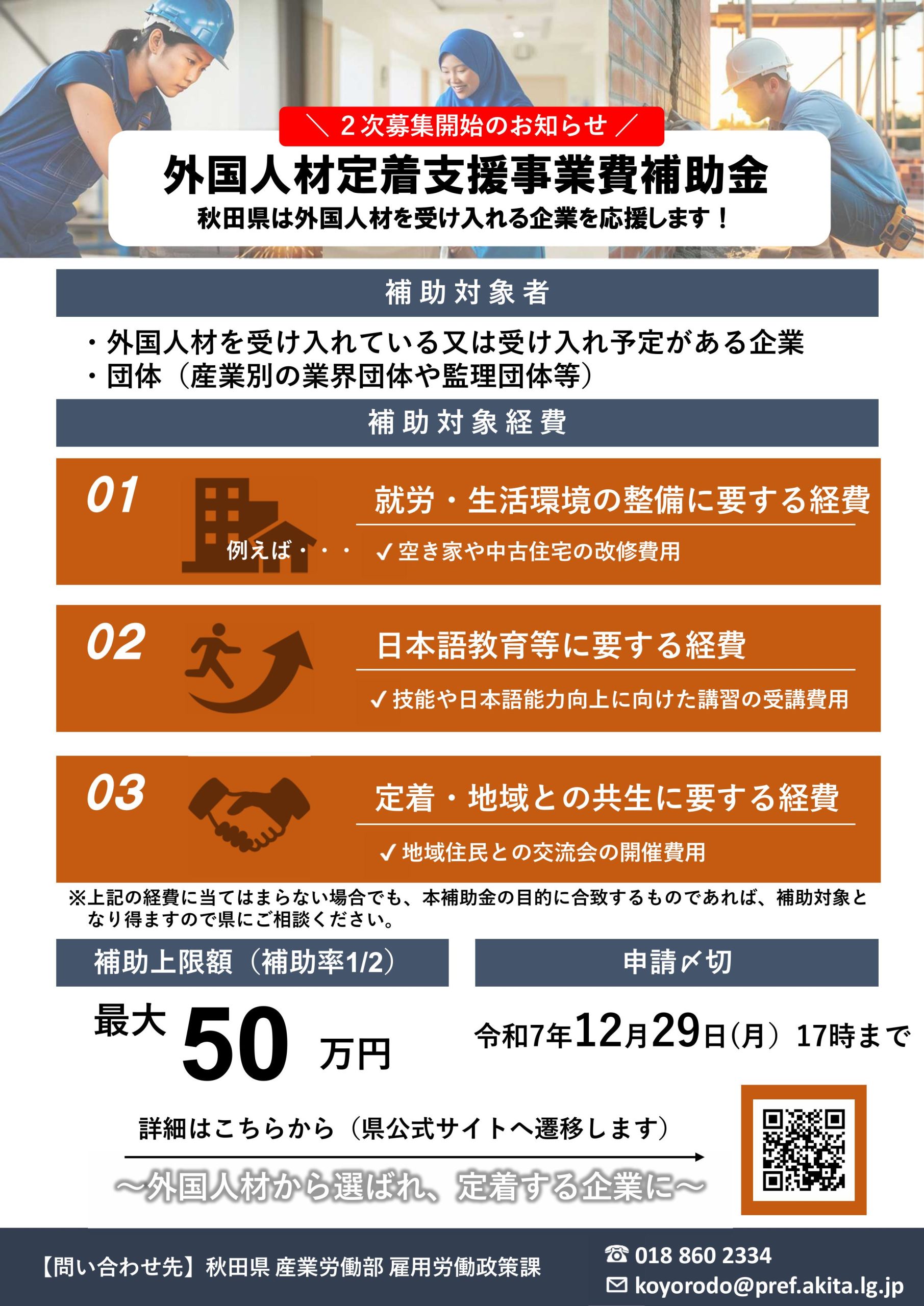 秋田県では「外国人材定着支援事業費補助金」の**追加募集(第2次募集)**が開始されました。